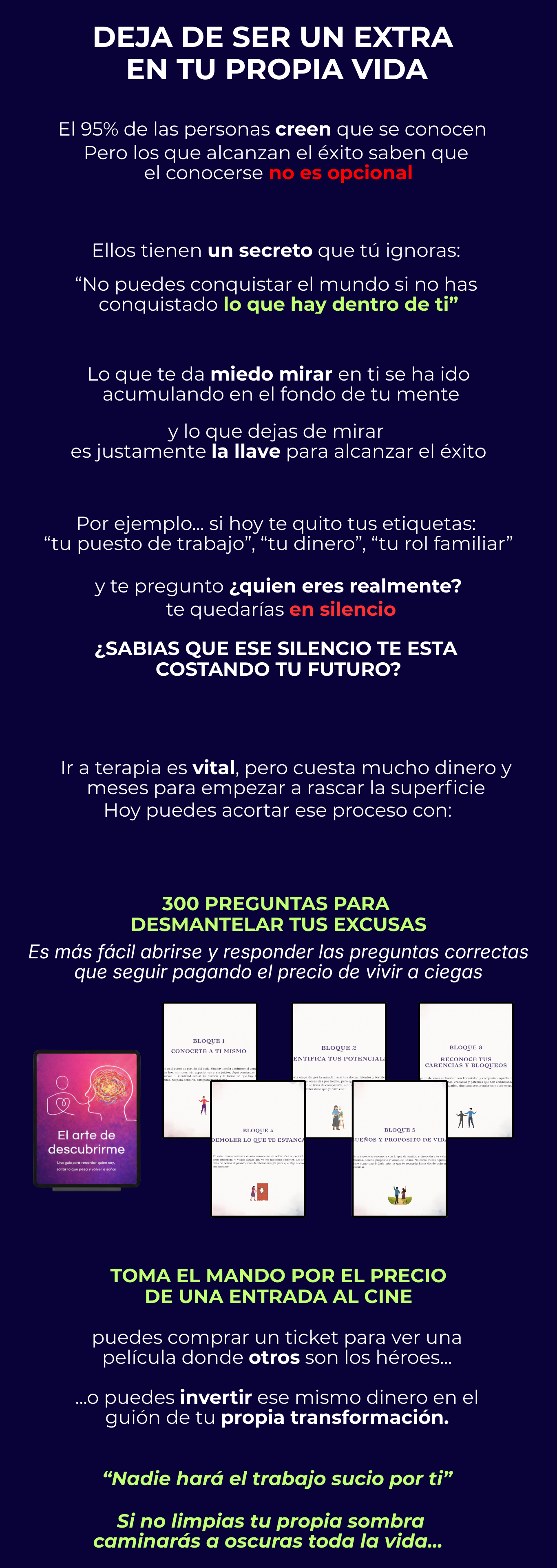 Es una guía digital de autoconocimiento y reflexión. Está diseñado para escribir, responder preguntas profundas y acompañarte en un proceso personal de exploración interior.